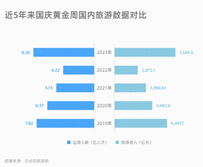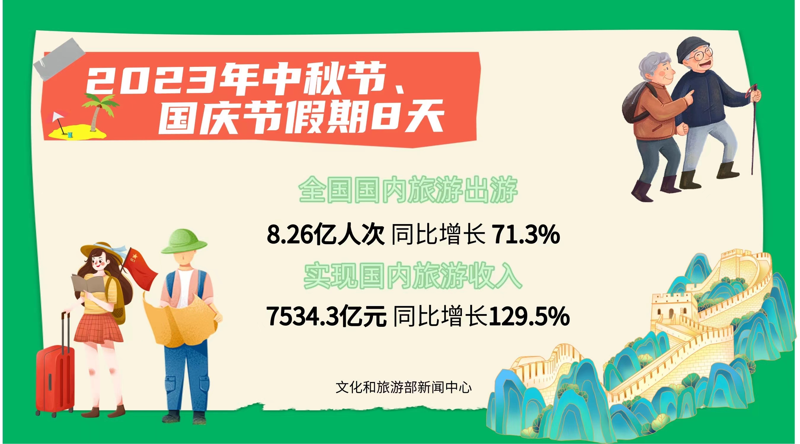 2023年中秋节、国庆节假期,文化和旅游行业恢复势头强劲,全国假日市场平稳有序。经文化和旅游部数据中心测算,中秋节、国庆节假期8天,国内旅游出游人数8.26亿人次,按可比口径同比增长71.3%,按可比口径较2019年增长4.1%;实现国内旅游收入7534.3亿元,按可比口径同比增长129.5%,按可比口径较2019年增长1.5%。