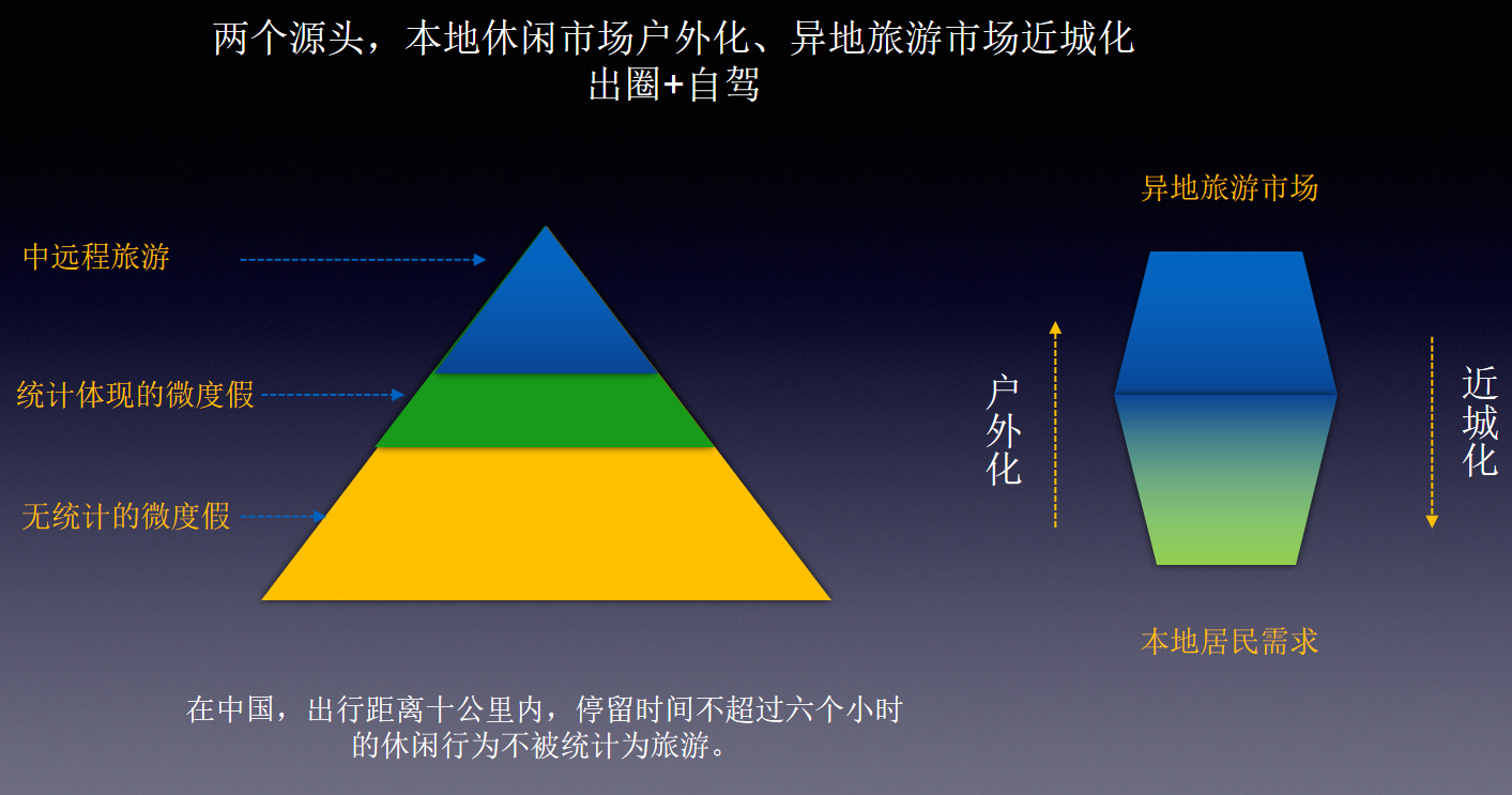 微度假已经成为社交媒体上一个非常火热的现象。这个现象的背后,我们来看数据,当前旅游的出游半径已经收缩到了一个百公里时代。左边的图是文旅部统计的几次假期游客的平均出行距离,可以看到出行距离持续在一个区间里面震荡,平均的距离就是在百公里左右。