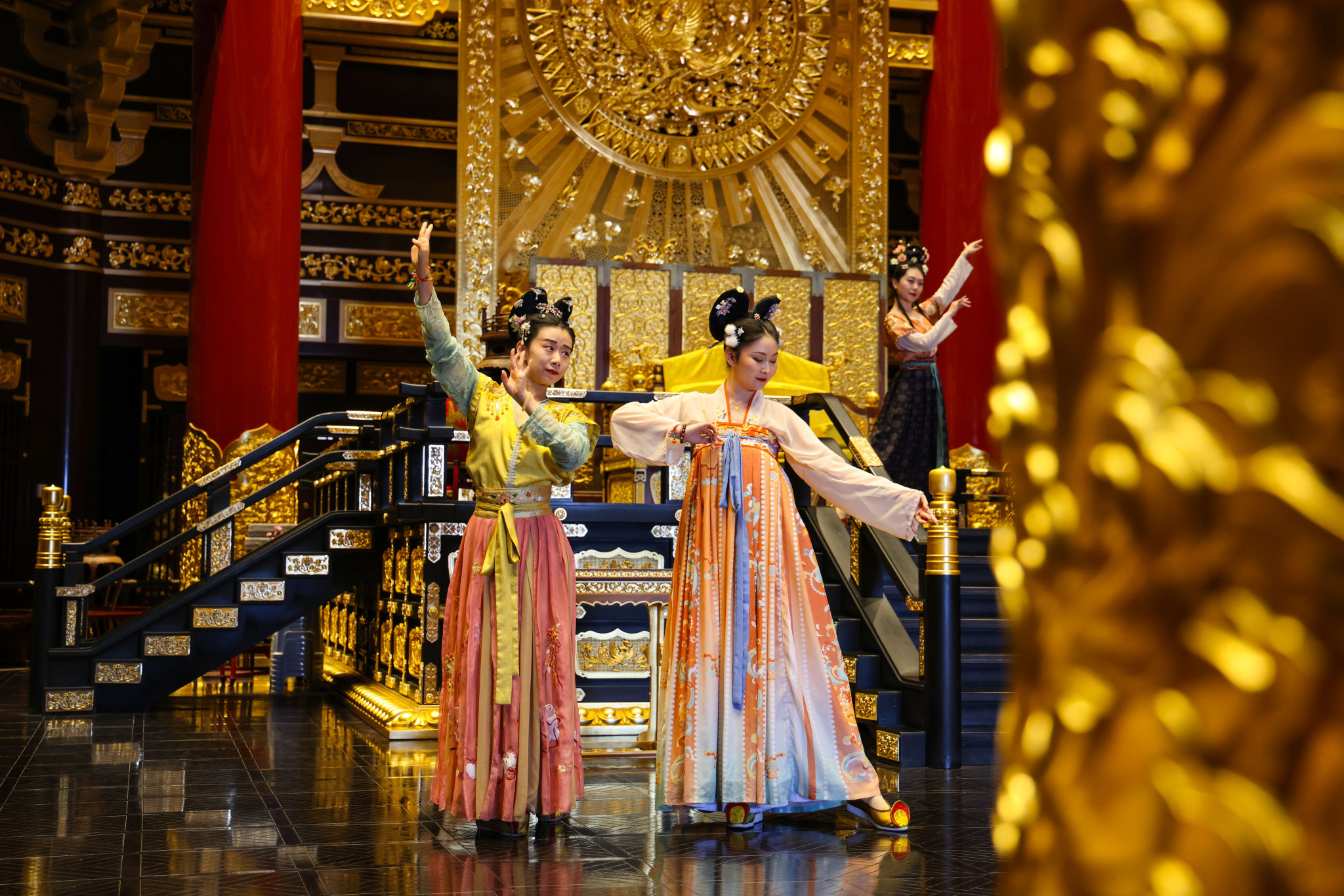 身穿汉服的演员在隋唐洛阳城明堂天堂景区内表演 记者 曹雪文 摄
