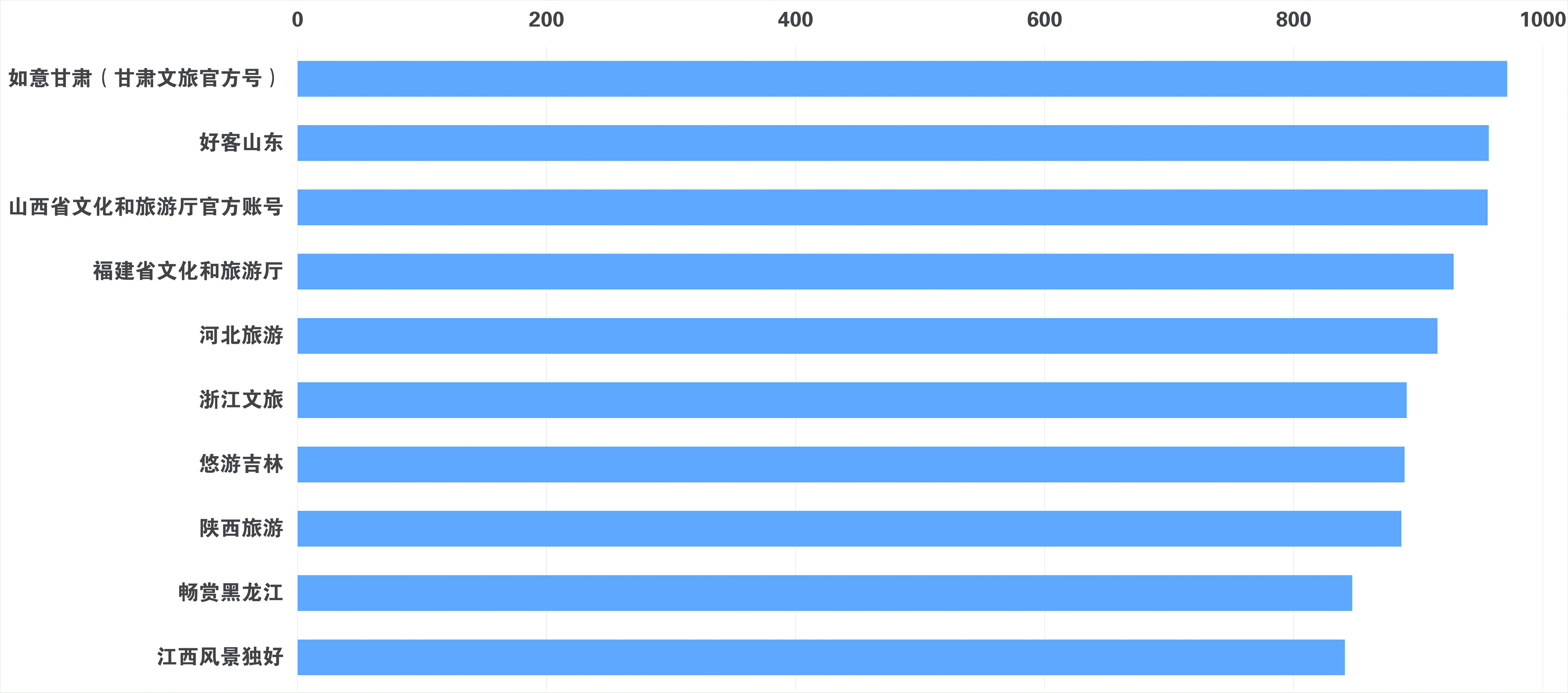 7月,省级文化和旅游政务微博传播力指数排在前列的为:文旅山东、微游甘肃、陕西省文化和旅游厅、重庆市文化旅游委、新疆是个好地方V、福建省文化和旅游厅、河北省文化和旅游厅、悠游吉林、四川文旅、江苏微旅游。监测时间范围内,文旅山东共发布微博1005条,转发19723次,评论47367条,总点赞数15.1万次。其中,原创微博998条,被转发19723次,评论47353条。
