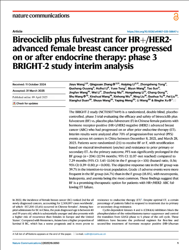 BRIGHT-2是中国医学科学院肿瘤医院徐兵河院士作为牵头人的一项随机、双盲、III期研究,评估吡洛西利在既往接受内分泌治疗疾病复发或进展的HR+/HER2-晚期或转移性乳腺癌患者中的疗效与安全性。本次在《Nature Communications》公布数据为该研究的期中分析结果。主要终点经研究者评估的吡洛西利联合氟维司群组无进展生存期(PFS)相比氟维司群组显著改善,达到预先设定的统计学要求。